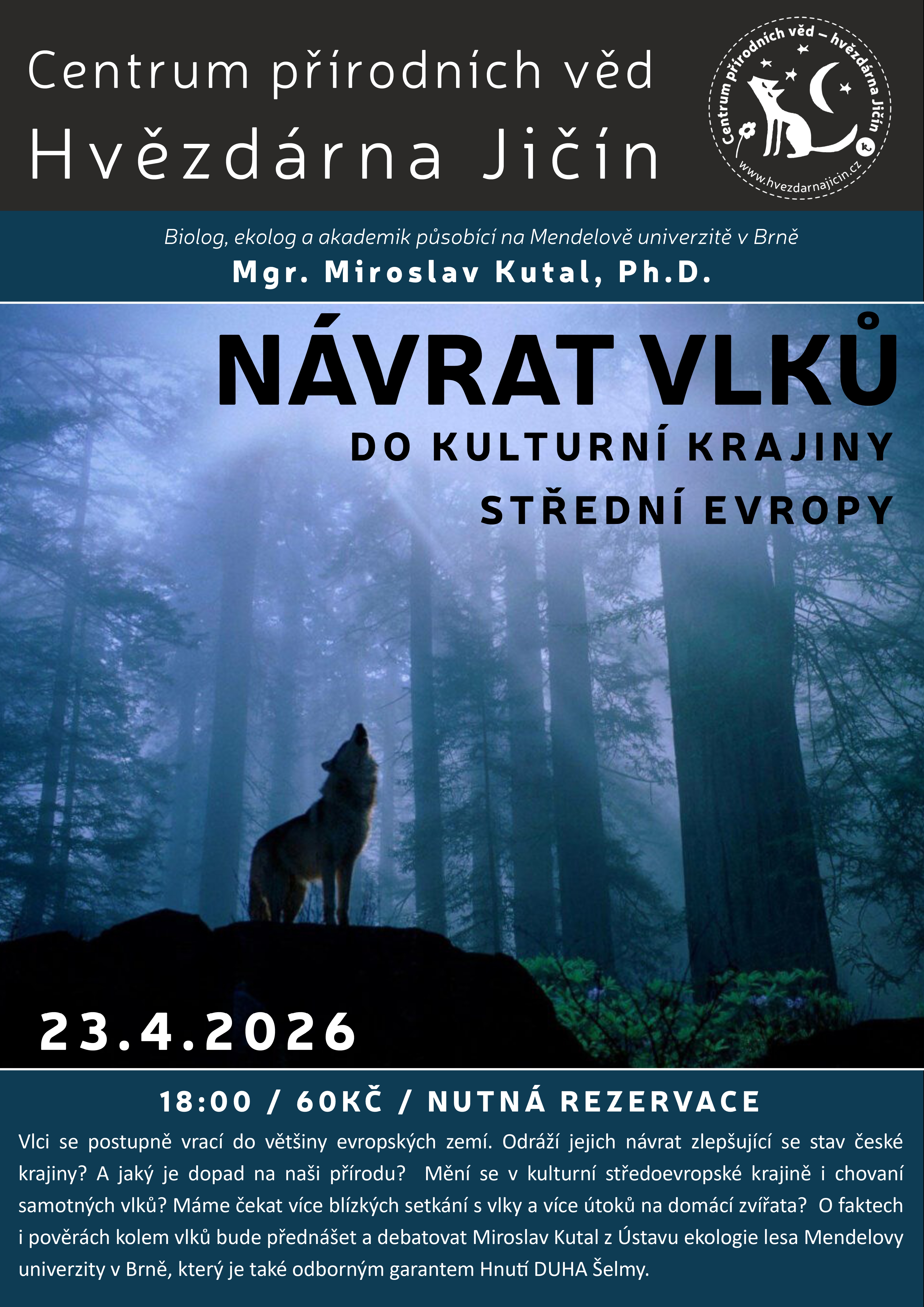 Vlci se postupně vrací do většiny evropských zemí. Odráží jejich návrat zlepšující se stav české krajiny? A jaký je dopad na naši přírodu? Mění se v kulturní středoevropské krajině i chovaní samotných vlků? Máme čekat více blízkých setkání s vlky a více útoků na domácí zvířata? O faktech i pověrách kolem vlků bude přednášet a debatovat Miroslav Kutal z Ústavu ekologie lesa Mendelovy univerzity v Brně, který je také odborným garantem Hnutí DUHA Šelmy.