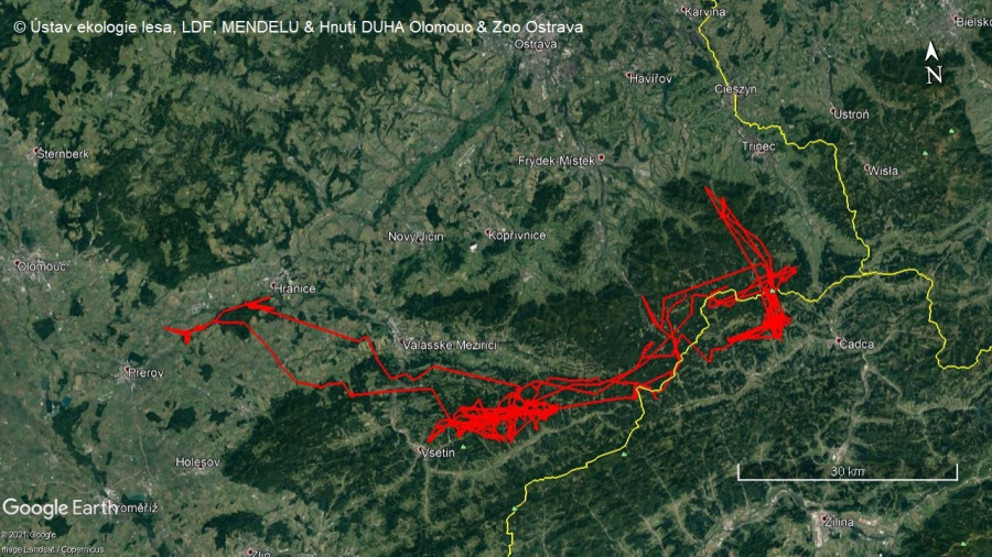 Víc jak roční sledování pěti rysích samců pomocí GPS obojků v Beskydech přineslo první výsledky. Vědci z Mendelovy univerzity zjistili, které části krajiny využívají rysové k přesunům. Telemetrie také ukázala, jaké úseky jsou z hlediska průchodnosti kritické a je potřeba je chránit. Míru prostupnosti krajiny v Beskydech a Kysucích sleduje Hnutí DUHA Olomouc dále pomocí fotomonitoringu v rámci mezinárodního projektu SaveGREEN [1], jehož partnerem je za tuto oblast i Centrum dopravního výzkumu. Dnešním dnem navíc zástupci Hnutí DUHA pokračovali ve zpřístupnění migračního koridoru velkých šelem a dalších živočichů u města Jablunkov. V biokoridoru odstraňovali ochranné oplocení u naváděcí zeleně, která teď po letech bude moci naplno zajišťovat svou funkci.