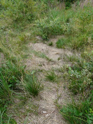 Druhý den jsme opět zamířili na vlčí chodník k naší fotopasti plni očekávání, zda se vlci na vybraném místě ukázali. Abychom však vlky nerušili v čase jejich největší aktivity z rána nebo večer, přicházeli jsme na lokalitu až kolem 11 hod dopoledne, kdy slunce již docela pálilo a čekali jsme, že budou v tu dobu někde zalezlí ve stínu. Pomalu jsme kráčeli po pěšince, snažili jsme tlumit každý krok, ale jak jsme se dostali do vysoké trávy, na dohled od fotopasti, moc platné nám to nebylo. Šustění zřejmě upoutalo zvědavé vlče, které běželo po pěšince proti nám. Jakmile nás spatřilo, na místě se obrátilo a utíkalo zase po chodníčku pryč, takže jsem ho ani nestačila zahlédnout.