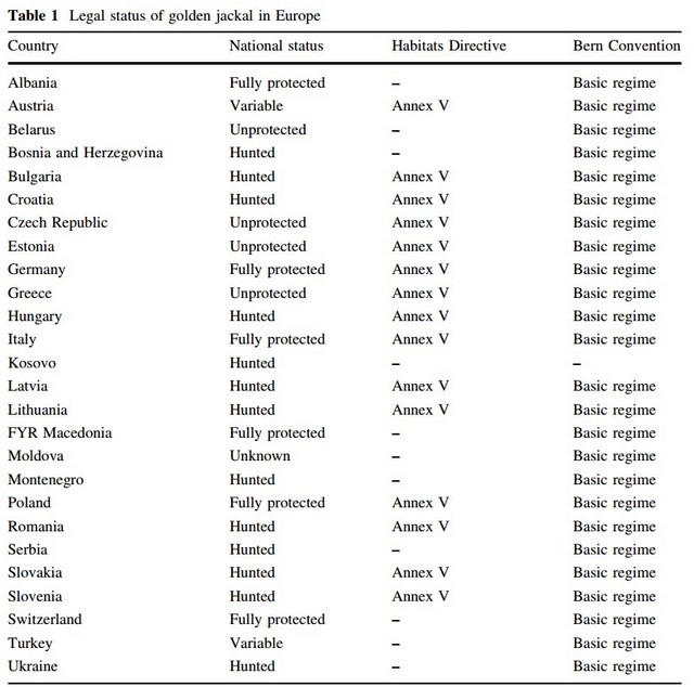 Na druhou stranu mezinárodní legislativa ani nezaručuje přísnou zákonnou ochranu. Situaci ilustruje tabulka níže, která ukazuje, jak jednotlivé země se šakalem „zachází“. Plné ochrany se mu dostává pouze ve státech, které mají v druhém sloupci tabulky údaj „fully protected“(například Švýcarsko, Itálie, Německo či Polsko); většinou je šakal loven dle zákona o myslivosti. U nás není nijak chráněn, ale ani není zařazen mezi zvěř (podle zákona o myslivosti), jeho lov je tedy legálně možný pouze se souhlasem orgánu ochrany přírody.