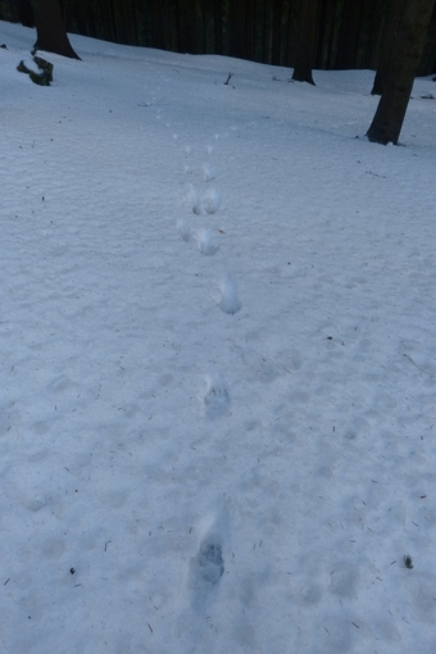 Využil jsem dobrých sněhových podmínek ke stopování a vyrazil do Javorníků. Na hřebenech hor bylo sněhu po kolena. Hned po půl kilometru chůze jsem našel pěkně zamrzlé rysí stopy, po kterých jsem se vydal bočním hřebenem na slovenskou stranu hor. Záhy jsem však pod Velkým Javorníkem narazil na čerstvé vlčí stopy. Vedly pěkně v čáře, tak jak je napsáno ve všech stopařských příručkách. Vzpomněl jsem si, že je to přesně rok, co jsem jednoho vlka v Javorníkách také stopoval. Jsem moc rád, že i po roce vlk v Javorníkách zůstal. Ostatně informace o tom, že zde žije jedna vlčice, jsme měli díky fotopastem celý loňský rok.